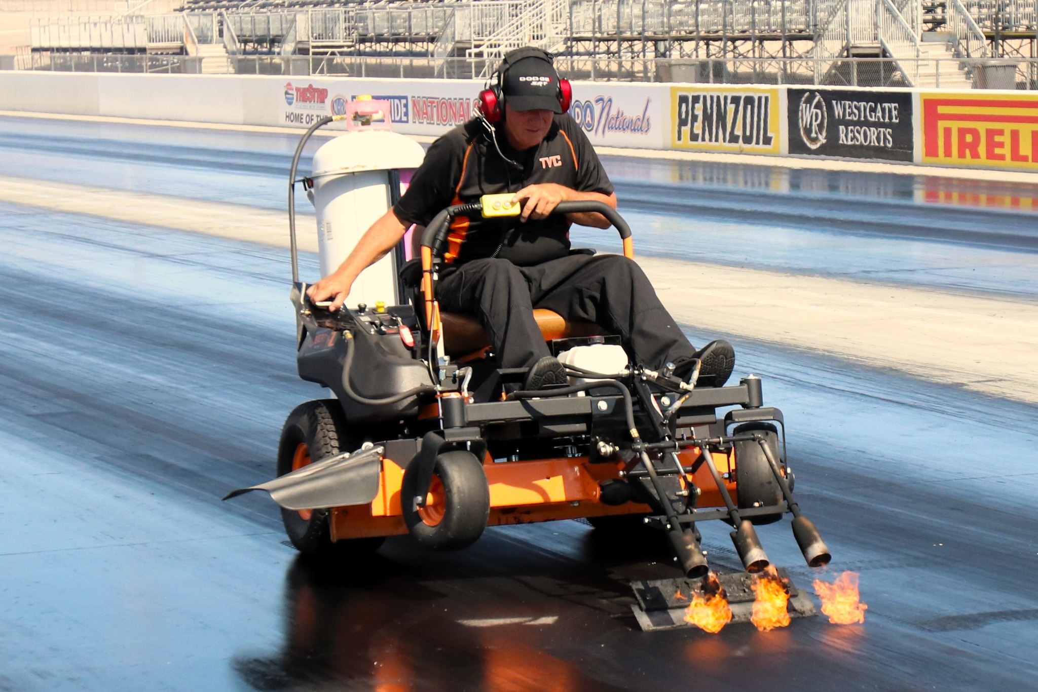 Sturdy scrape system allows both hard scraping and skim scraping abilities. Electric over hydraulic raise and lower controls are at your fingertips. Up to 600,000 BTU of propane power heat is available. Variable allows quality scraping even in cold weather. The propane supply valve is in ergonomic reach, which greatly reduces propane usage and creates fewer on-track rubber fires. The scraping blade replacements are easily obtainable (TVC house units have utilized the same blade for over 9 months of weekly service). The blade is to be flipped and serviced without removing from the scrape assembly.